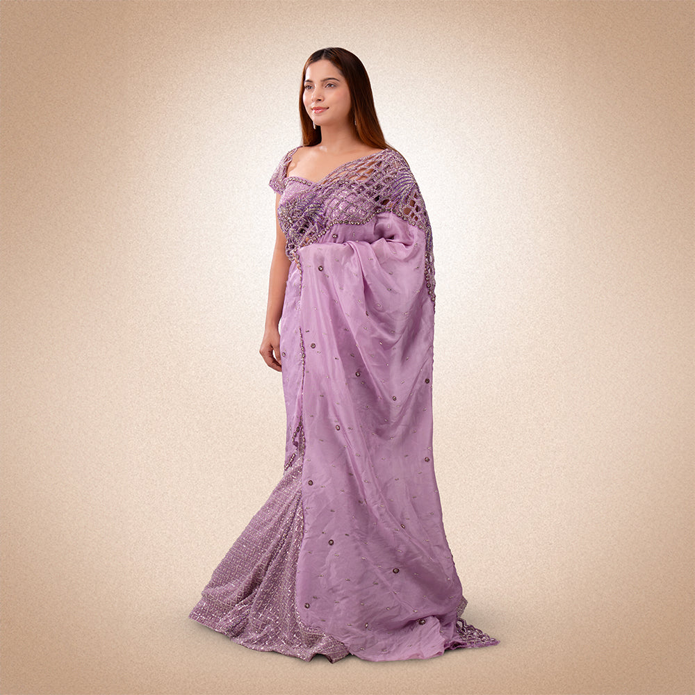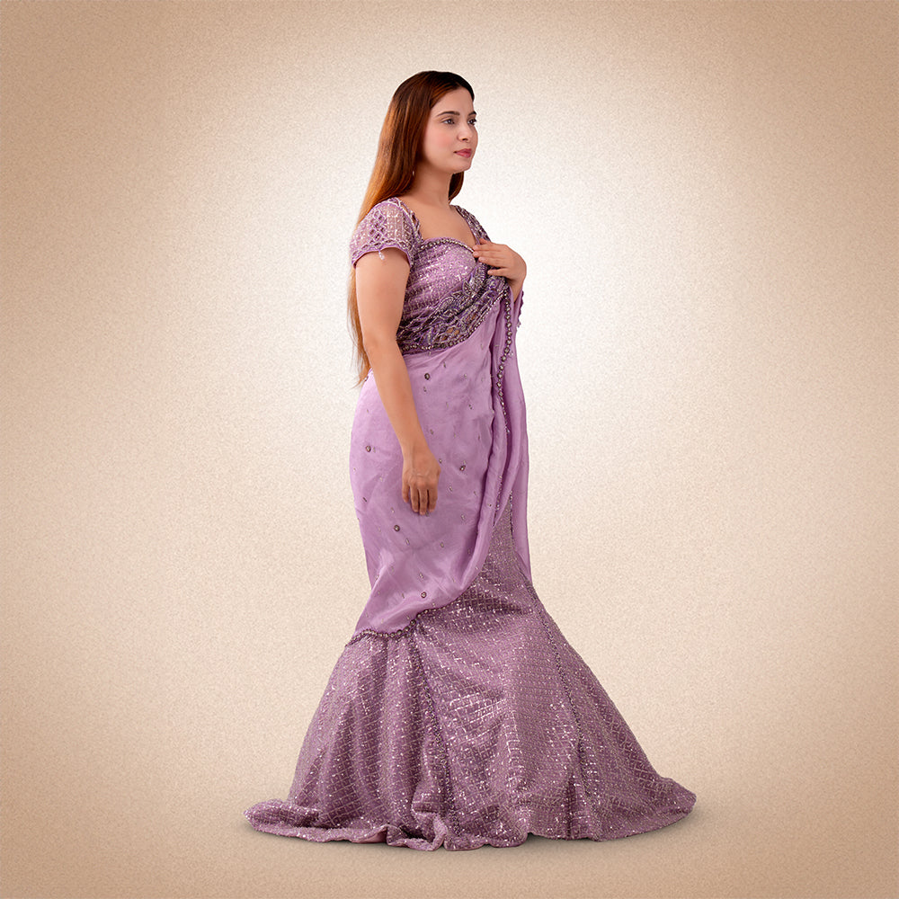 Unveil your inner diva with our Lavender Sequined Mermaid Lehenga Saree, a captivating fusion of elegance and modern flair. Designed in a soothing lavender shade, this ensemble features a mermaid-cut lehenga paired with a delicately embellished blouse and a matching dupatta that drapes like a saree.