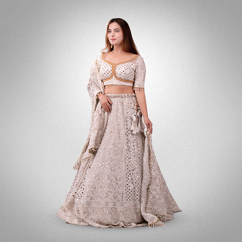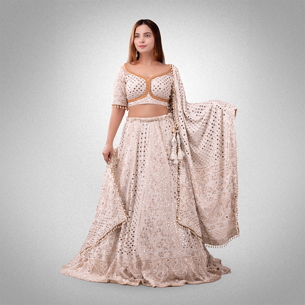 Step into timeless elegance with our Ivory Mirror Work Bridal Lehenga, a masterpiece crafted to celebrate grace and grandeur. This ethereal ensemble in a soft ivory hue is intricately adorned with mirror work and zari embroidery, creating a mesmerizing play of light and texture.
